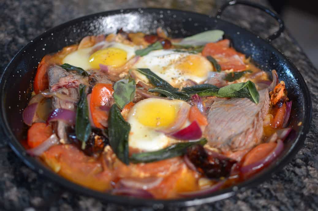 Casser les œufs sur la viande et les légumes, puis couvrir. Laisser cuire pendant 12 minutes ou jusqu’à ce que la viande soit cuite à votre goût.