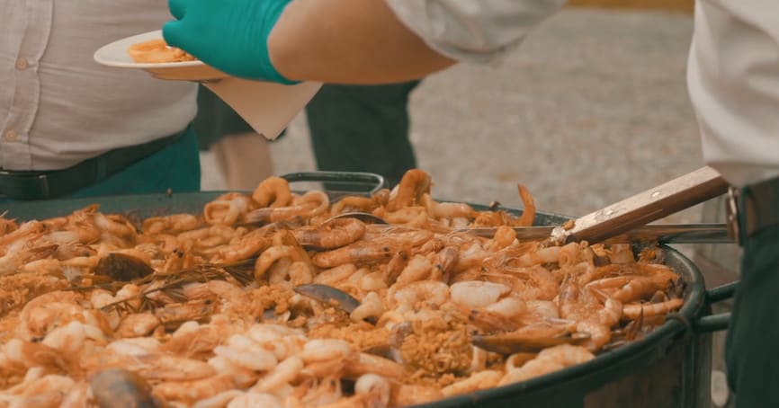 Chorizo, Chicken Pilon, squid, giant shrimp, mussels, clams, snow crab, grated fresh tomatoes, Valencia Bomba rice, vegetables, supreme saffron and other spices.